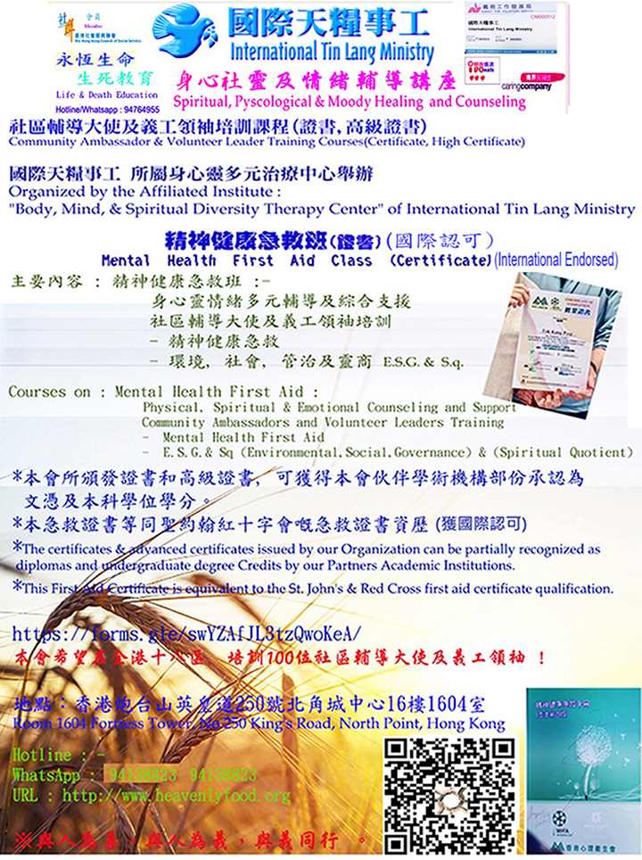 國際天糧事工主辦心靈及情緒咨詢和支援服務